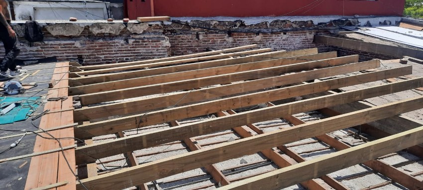 Los trabajos comprenden el recambio de 240 m2 de tirantes, entablados y chapas, además de que se cambio la pendiente del techo para evitar la canaleta interna y de esta manera deje de filtrarse agua.