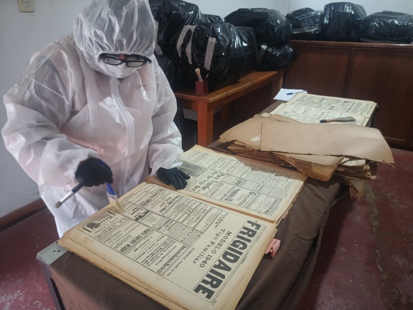 Finalizada esa etapa, comenzó el trabajo de limpieza hoja por hoja y el retiro de elementos metálicos en los paquetes, una tarea delicada que requiere tiempo, paciencia y cuidado extremo. En las imágenes puede observarse a los trabajadores del archivo utilizando trajes de protección, guantes y barbijos, manipulando cuidadosamente los periódicos sobre mesas preparadas para la tarea. Con pinceles se retira el polvo acumulado durante décadas, evitando ejercer presión sobre el papel envejecido y frágil.