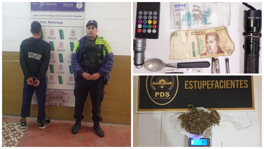 Al momento de la requisa, el personal policial identificó al sospechoso, quien entre sus pertenencias tenía: un control remoto de sistema de luces vehiculares, una linterna negra y un cargador de celular para auto, dinero en efectivo (todos elementos que fueron identificados como propios por la víctima) y además poseía entre sus prendas tres pipas y un envoltorio con 4.7 gramos de cogollos de marihuana.
